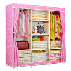 索尔诺 布衣柜简易布衣柜 大号衣柜 双人卧室收纳衣服柜居家宿舍衣橱收纳柜 拉帘粉色圆点款